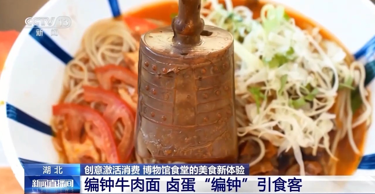 在湖北省博物馆二楼的咖啡厅,最受欢迎的当数这款“网红”产品——编钟牛肉面。而它最大的亮点,就在于那颗复刻了编钟造型的卤蛋,不少游客特意来体验这份独特的“穿越感”。