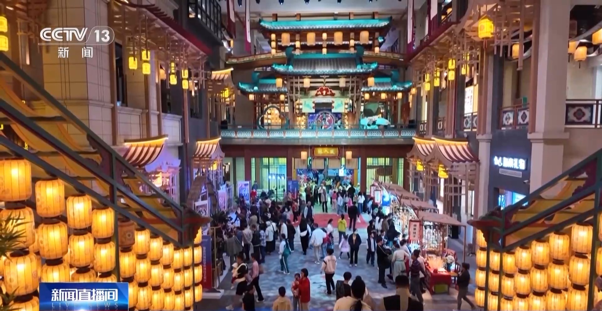 总台记者 董彬:穿过广场,走进东坡老码头的东大门,就相当于进入了这艘游船的船舱。而游客们可以在这里体验“一秒入宋”。老码头在里面也专门准备了各类的NPC互动,游客可以通过完成任务的方式,获得“琼州交子”货币,而拿着这些货币就能够在老码头享受到购物的优惠以及换取奖品。