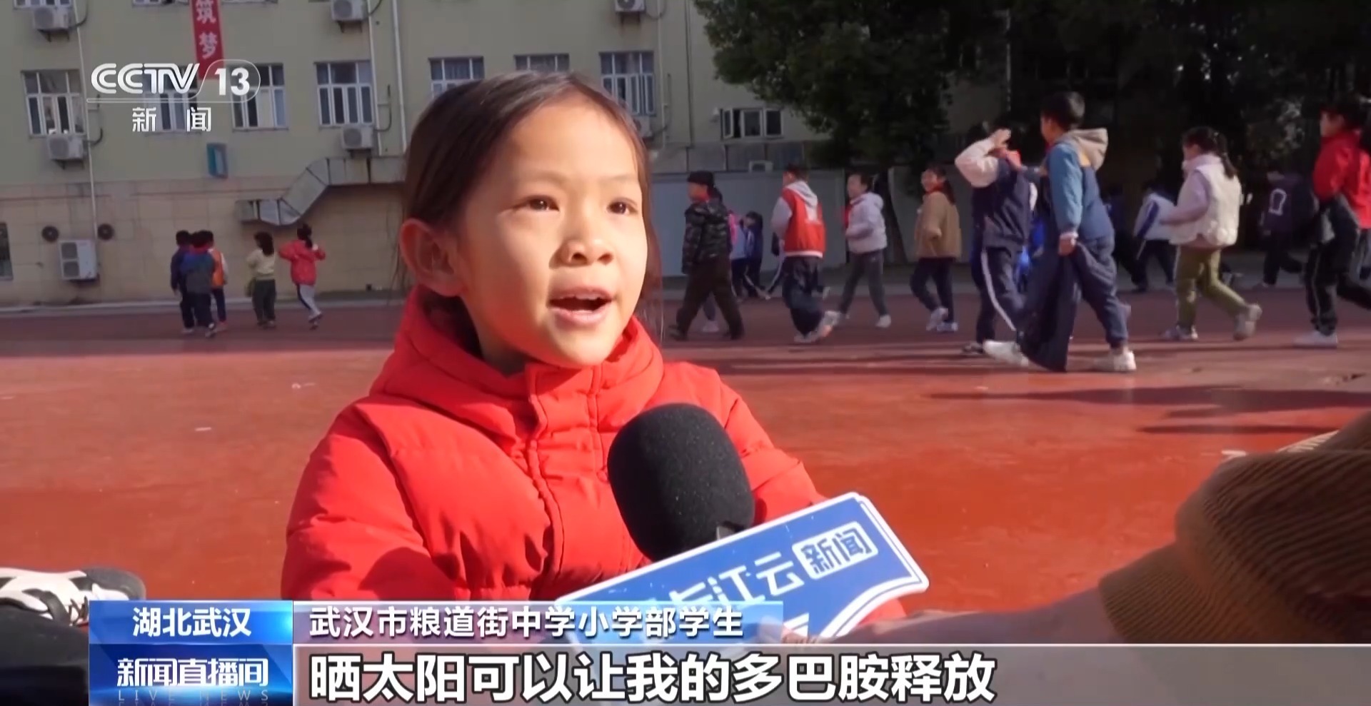 武汉市粮道街中学小学部学生:20分钟晒完太阳以后,就会让我的精神更好,上课的时候脑袋也会更灵活一些。