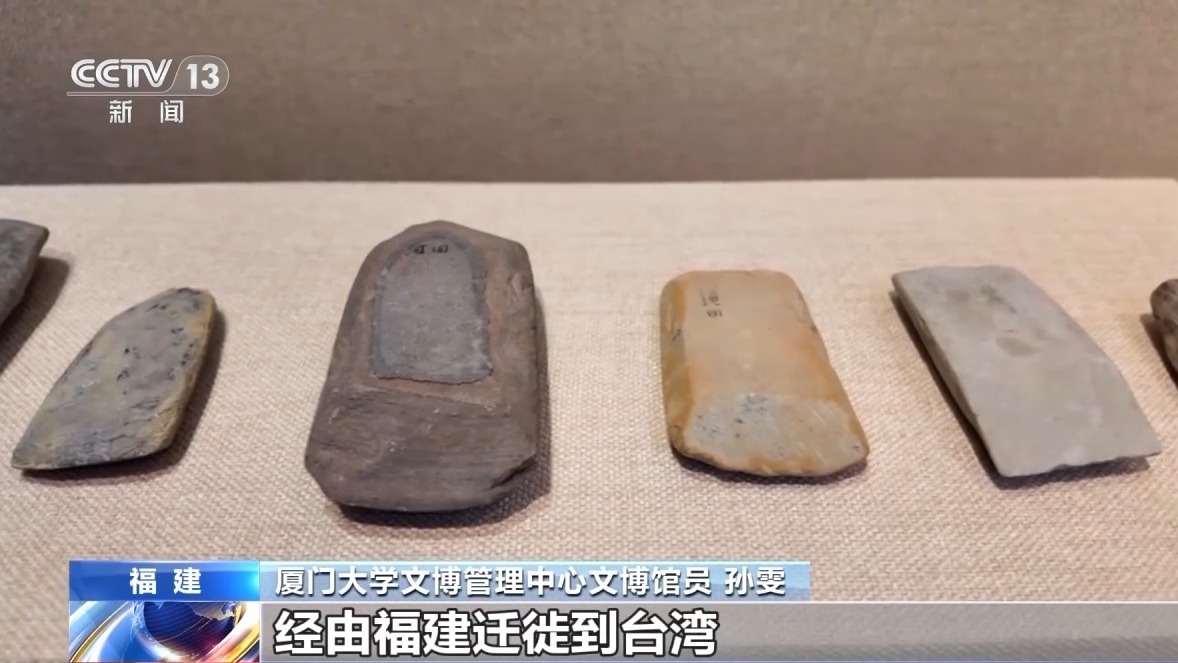 厦门大学文博管理中心文博馆员 孙雯:这两块石器,右边这一块是出土于我们福建的武平,左边这个上面有很清晰的记载,是台湾圆山遗址出土的,就是我们常说的“有段石锛”。它的独特之处在于,目前为止,它主要在我国的东南沿海以及我们中国台湾地区,还有东南亚诸岛,成了我们南岛语族起源并且迁徙的一个非常有力的物证。证明了南岛语族从我国长江流域起源,经由福建迁徙到台湾,再通过台湾迁徙到菲律宾群岛以及太平洋上的诸岛屿,也是证明了我们海峡两岸自史前时候开始就是血脉相连的关系。