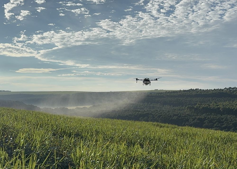 2025年3月25日,在南非夸祖鲁-纳塔尔省的方廷希尔庄园,中国农用无人机为甘蔗林喷洒杀菌剂。新华社记者 白舸 摄