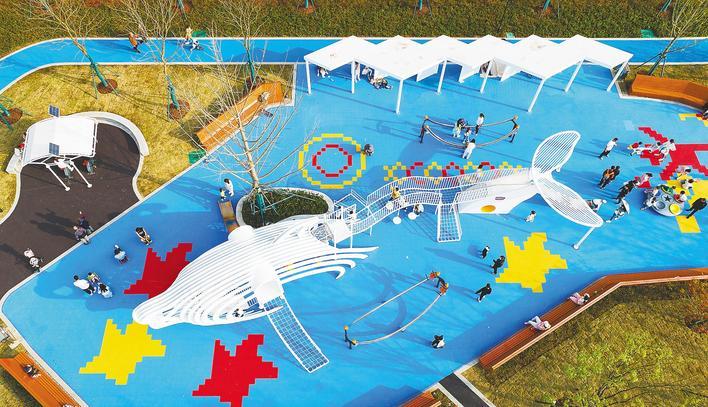 孩子们在武汉市江汉区远洋鲸奇儿童友好公园内玩耍。 (湖北日报全媒记者 薛婷 摄)