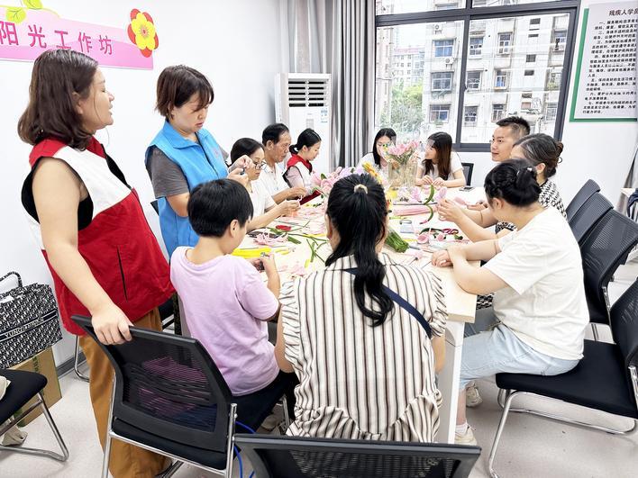 天虹社区残疾人之家内设康复训练、就业培训、心理咨询等多功能区域。常态化开展“残疾预防日”等主题活动和家属照料技能培训,并每年两次为残疾人提供免费体检。通过开设布烙画、扭扭花等手工课程,成功带动15名残疾人实现自主就业。同时,积极整合社会资源,累计获赠爱心款物超2万元,建立了可持续发展的社区助残服务模式。