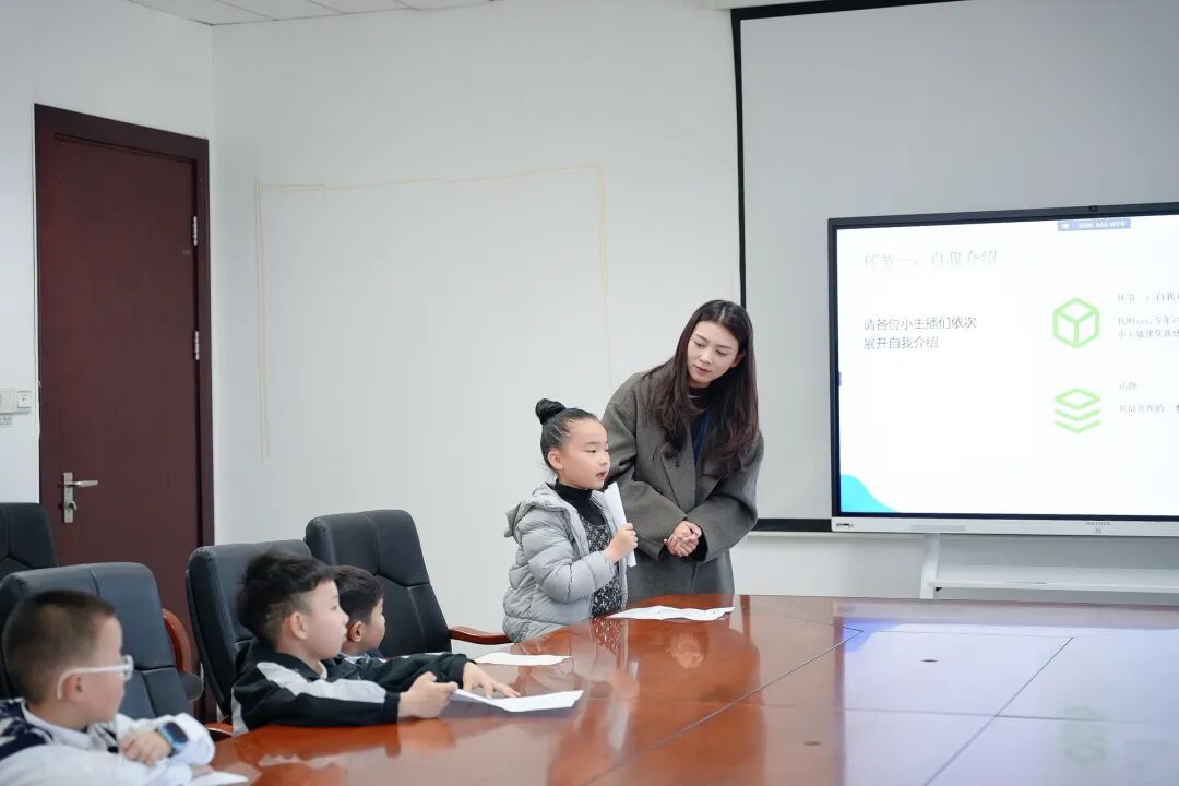 在老师的鼓励下,小主播们自信地走上演播台,对着镜头调整姿态,用清晰发音、饱满情感完成专属播报。