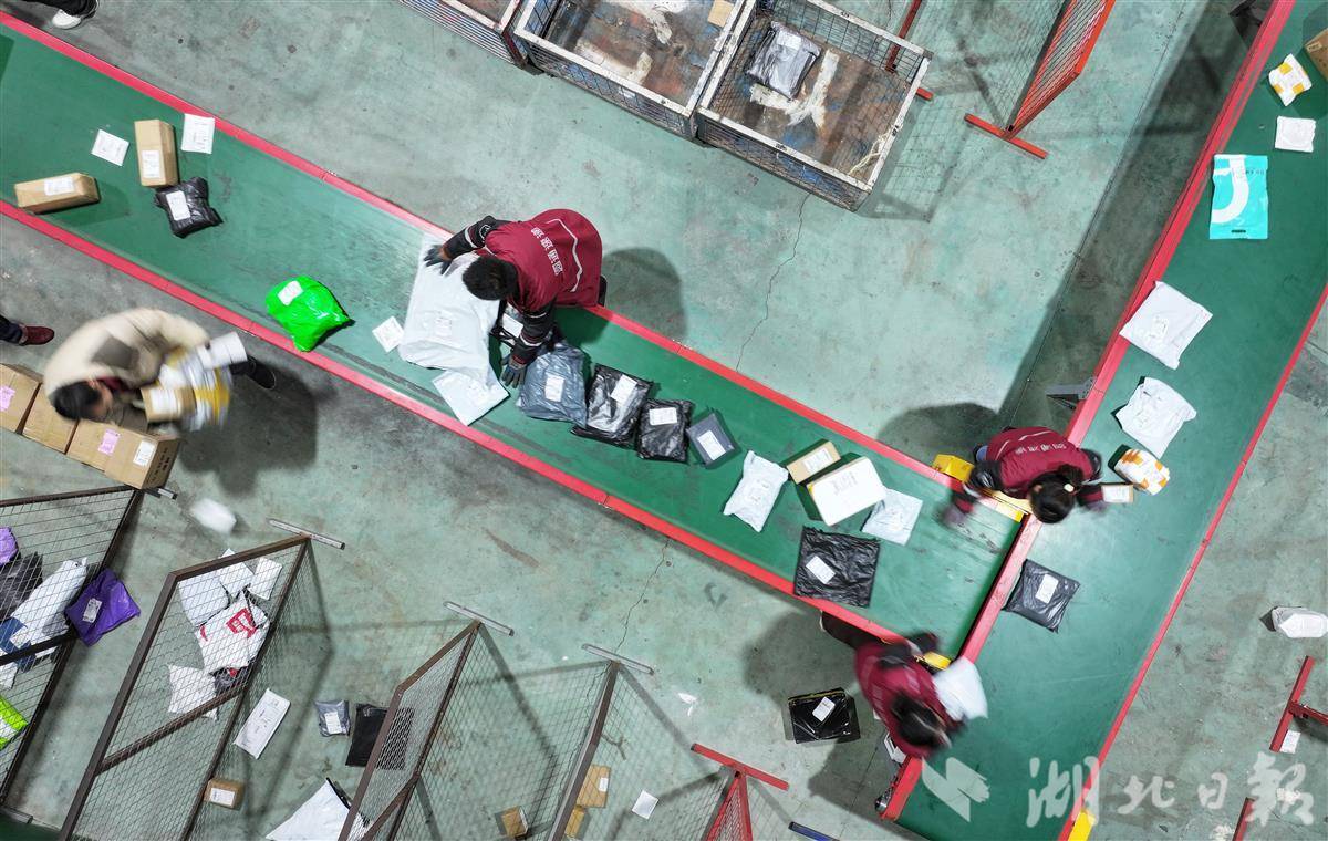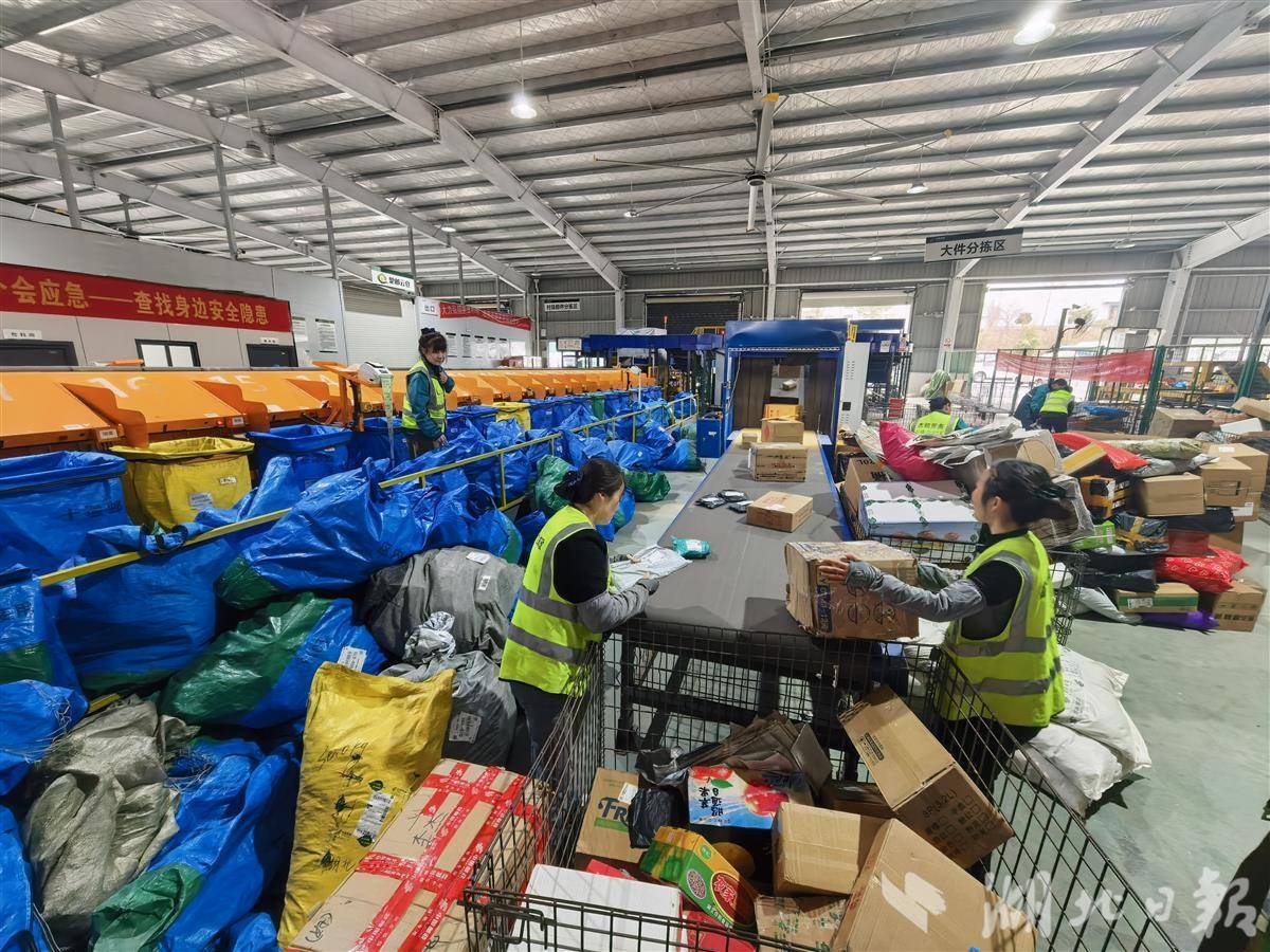 竹山县寄递物流公共配送中心内,工作人员正在分拣来自各地的快递,不少快递将通过无人机运送到偏远乡村。