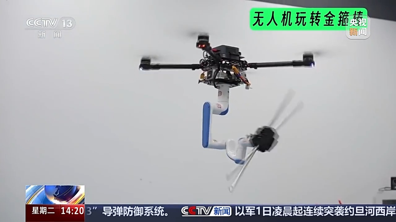 西湖大学智能无人系统实验室博士生 季梦玉:机械臂对无人机有一个干扰,这样就会让它的无人机的位置和姿态有剧烈变化,反过来它对机械臂也有干扰,所以两个之间有强烈的耦合关系,这个力还是很大的。比如说我在森林防火或者扔急救包的时候,我可能需要比较大的初速度给它扔下去,扔到一个位置,或者是我在空中摘果实,把果实扔到对应的篮子里边。