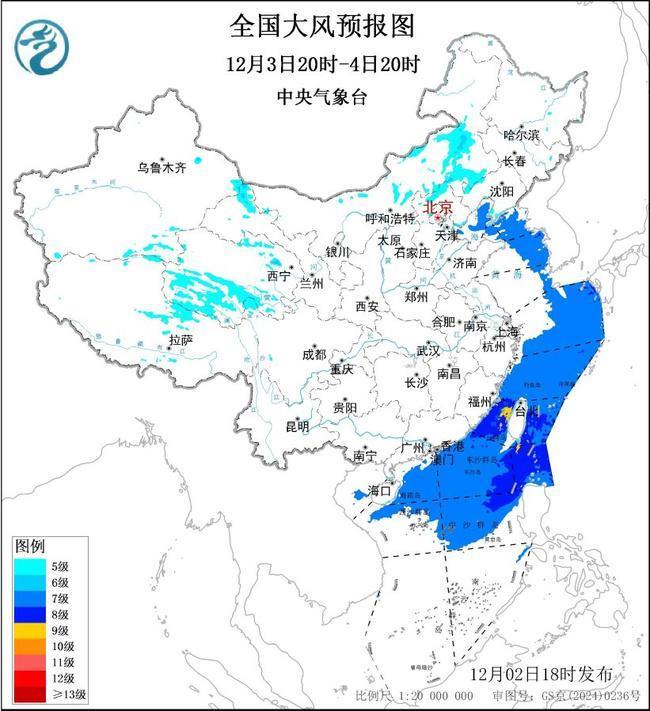12月3日20时至4日20时,内蒙古中部、河北北部、辽东半岛、甘肃西北部、青海南部、西藏北部等地部分地区有5~6级风,阵风7~9级。渤海、渤海海峡、黄海北部和中部、东海、台湾海峡、台湾以东洋面、巴士海峡、南海北部和中部、北部湾南部海域将有7~8级、阵风9~10级的大风,其中台湾海峡和巴士海峡部分海域风力可达9~10级、阵风11~12级。