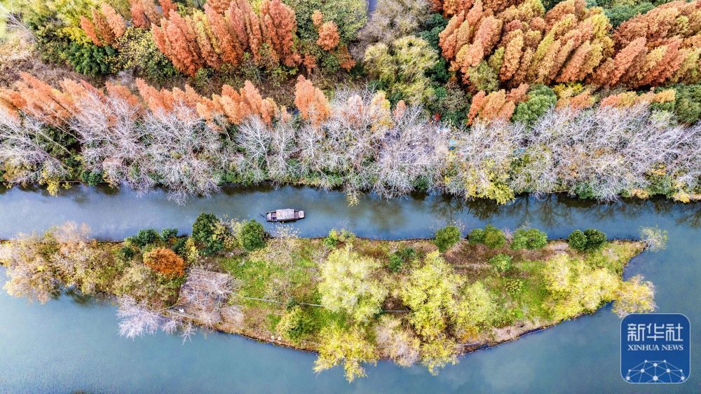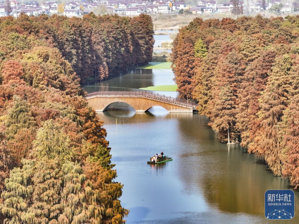 ↑ 12月1日,游客乘船在江苏省兴化市李中水上森林公园赏景游玩(无人机照片)。