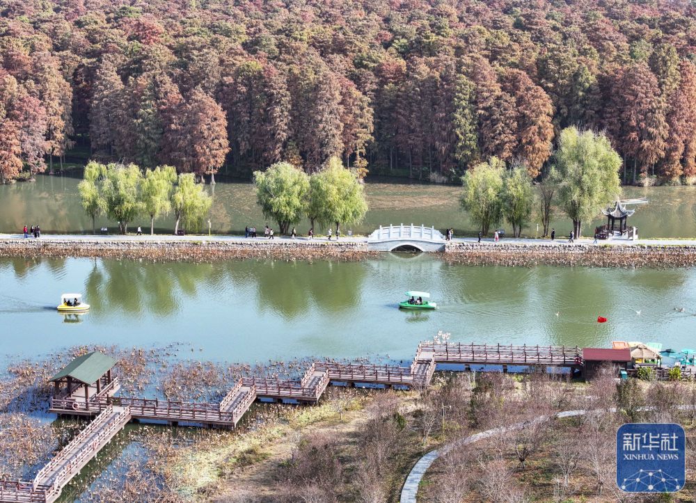 ↑ 12月1日,游客在江苏省兴化市李中水上森林公园赏景游玩(无人机照片)。