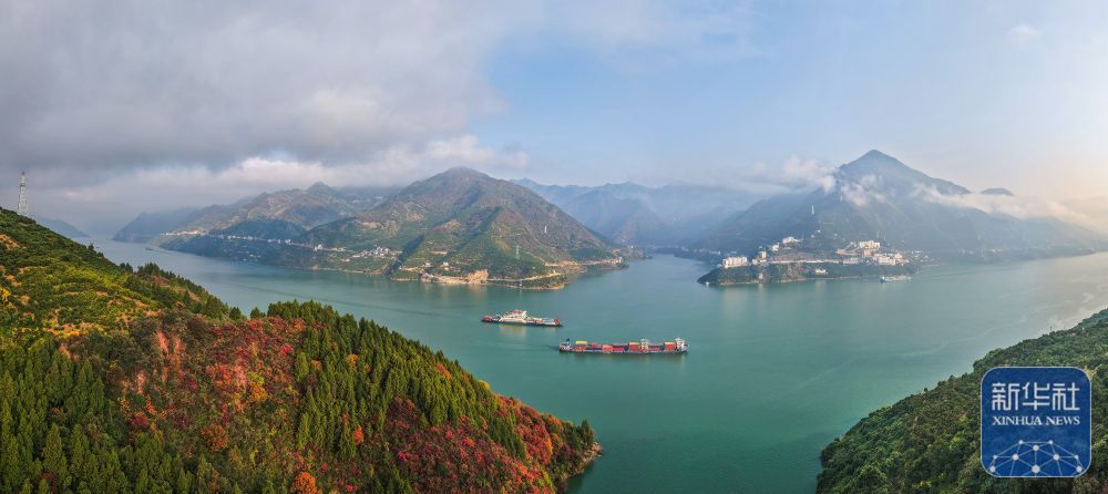 ↑ 12月1日,船舶行驶在湖北省秭归县沙镇溪镇树坪村外沿水域(无人机全景照片)。