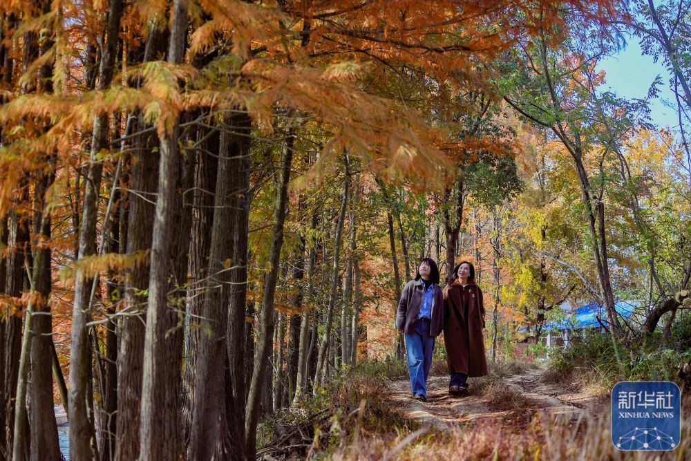 ↑ 12月1日,游人在浙江省兰溪市永昌街道一处水杉林赏景游玩。