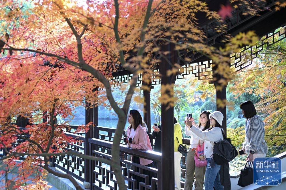 ↑ 12月1日,游客在江苏省昆山市亭林园赏枫拍照。