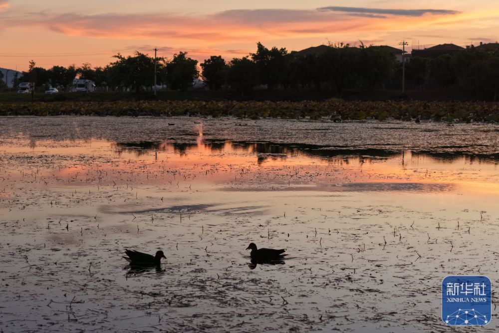 ↑ 12月1日,候鸟在云南省腾冲市东湖公园栖息(无人机照片)。