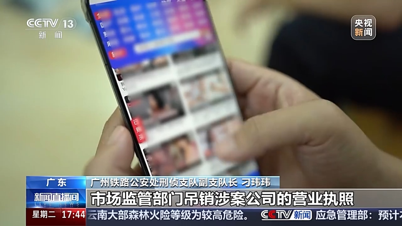 广州铁路公安处刑侦支队副支队长 刁玮玮:淫秽网站严重污染了网络环境,特别是未成年人如果浏览了这些内容,极易诱发违法犯罪。因此,我们也同步协调了网信部门查堵涉黄域名5653个,市场监管部门吊销涉案公司的营业执照。