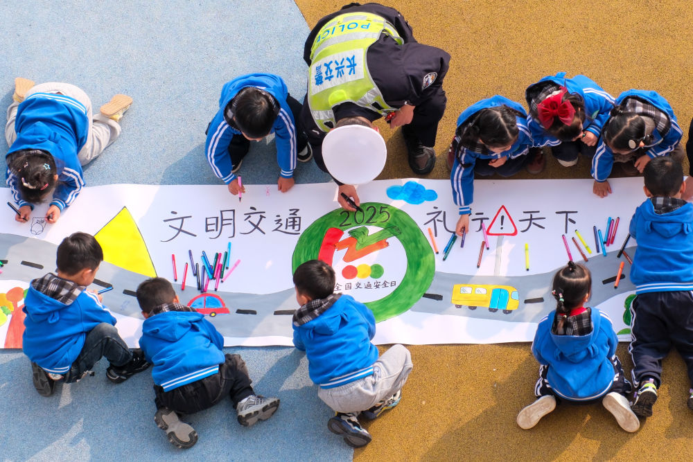 12月1日,浙江省湖州市长兴县水口乡中心幼儿园,长兴县公安局水口派出所交警中队工作人员与小朋友一起绘制交通安全主题画卷。新华社发(谭云俸摄)