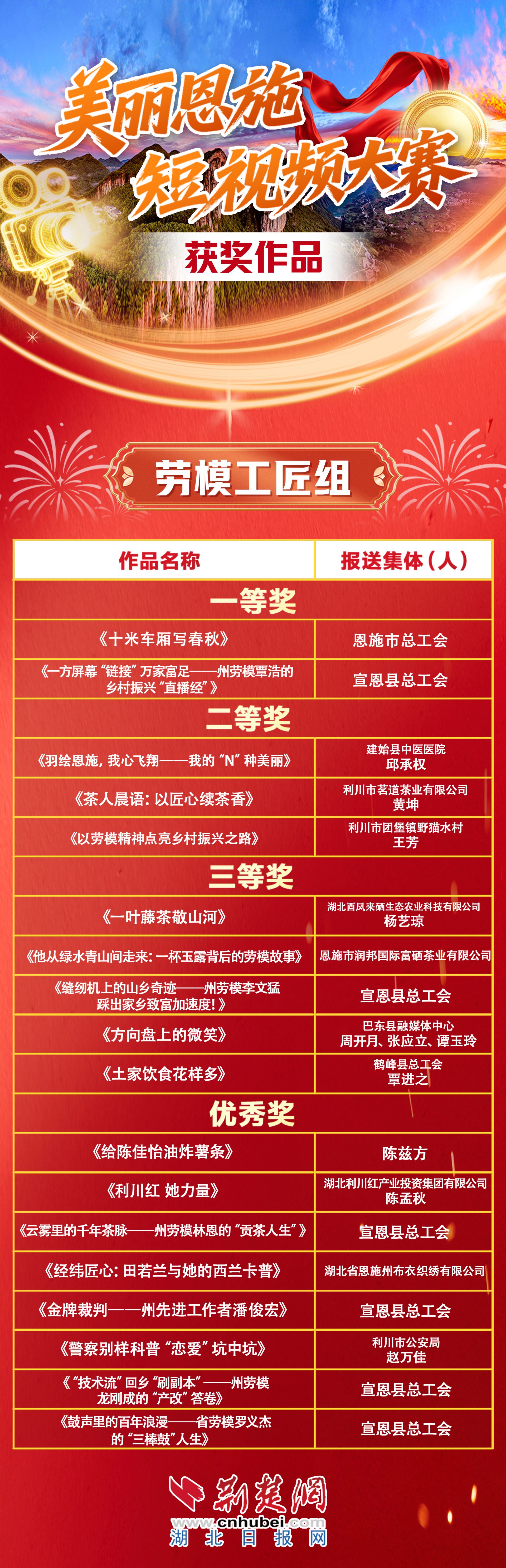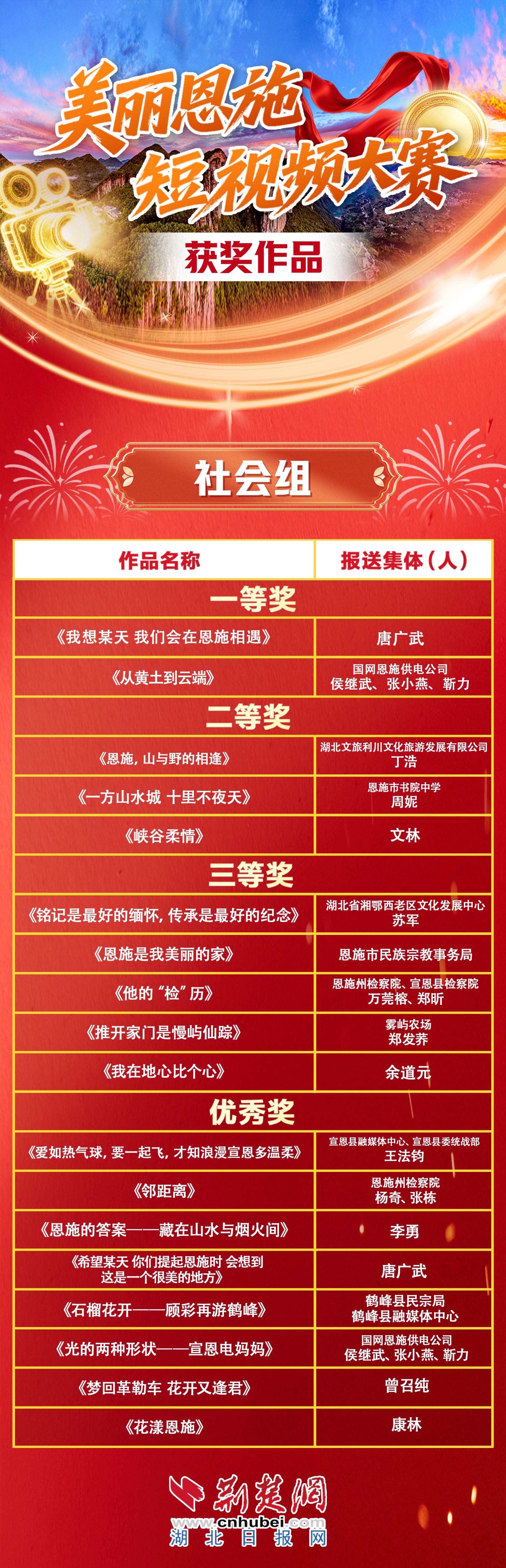 荆楚网(湖北日报网)讯(记者杨宝 通讯员梁义雯)12月2日,由恩施州委统战部、州总工会、团州委、州民宗委联合举办的“美丽恩施的‘N’种美丽”短视频创作大赛评选结果揭晓,54部作品获奖。