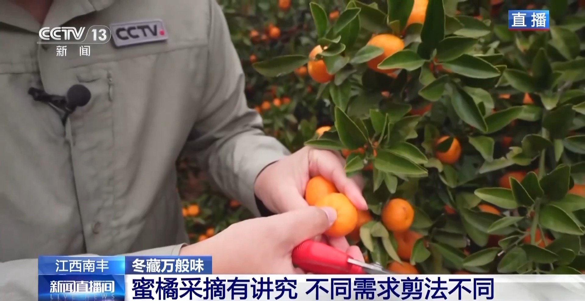 总台记者 刘昀彤:在江西南丰县东坪乡的一处果园里,挂满蜜橘的橘子树一共有七千多株。现在农户们正在把蜜橘从沉甸甸的枝头上采摘下来。根据气候,立冬时节蜜橘就差不多成熟开始采摘,现在基本上已经是在采摘最后的一部分。一般一棵橘树种下后到第三年开始挂果。第五年达到盛果期,寿命有四五十年。果园的负责人告诉我,这样一株橘树能采摘300斤左右的蜜橘,每亩的产量在3500斤左右。