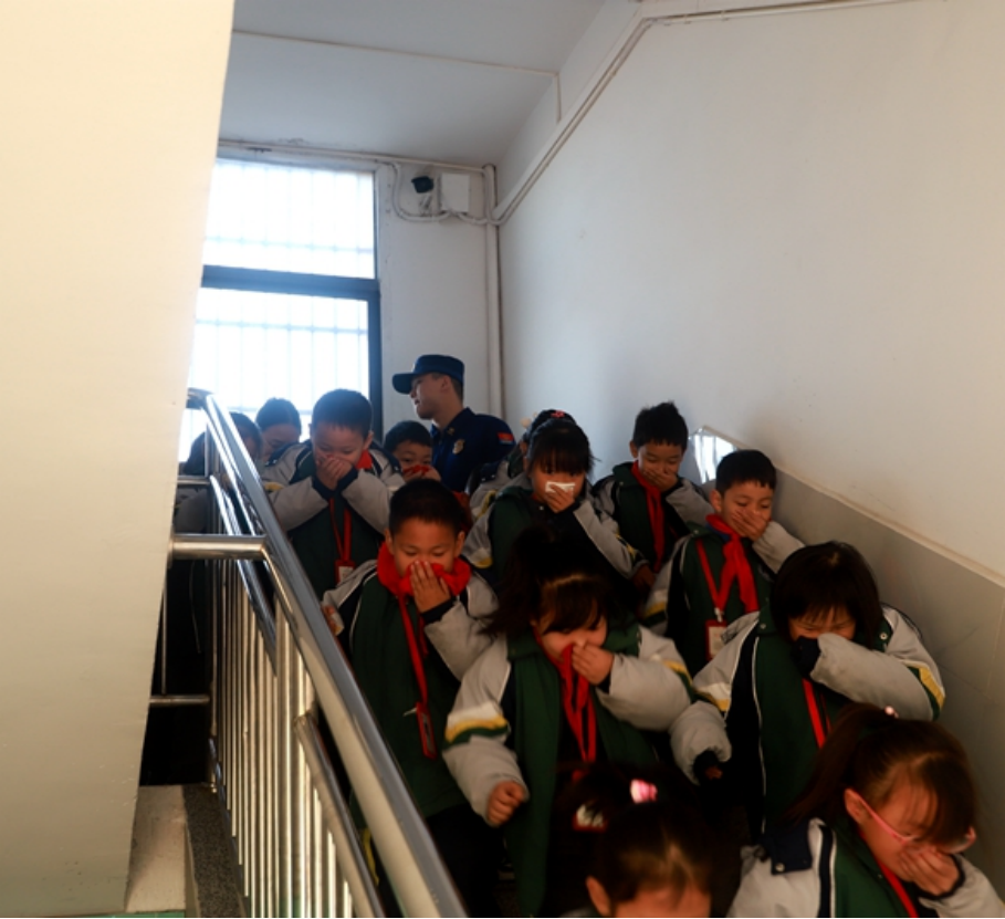 上午8点整,消防安全疏散演练正式开始。火情假设在学校教学楼二楼突发大火,警报声响后,学生在老师的组织带领下用湿毛巾捂住口鼻,俯身弯腰沿着疏散楼梯有秩序地迅速撤离至操场。在短短3分钟内,500余名师生安全地从“火海”逃生,完成疏散演练。