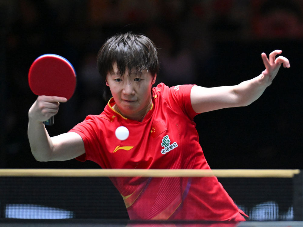 ↑ 中国队选手王曼昱在女单比赛中。她3比0战胜法国队选手普利蒂卡·帕瓦德。 新华社记者 胥冰洁 摄