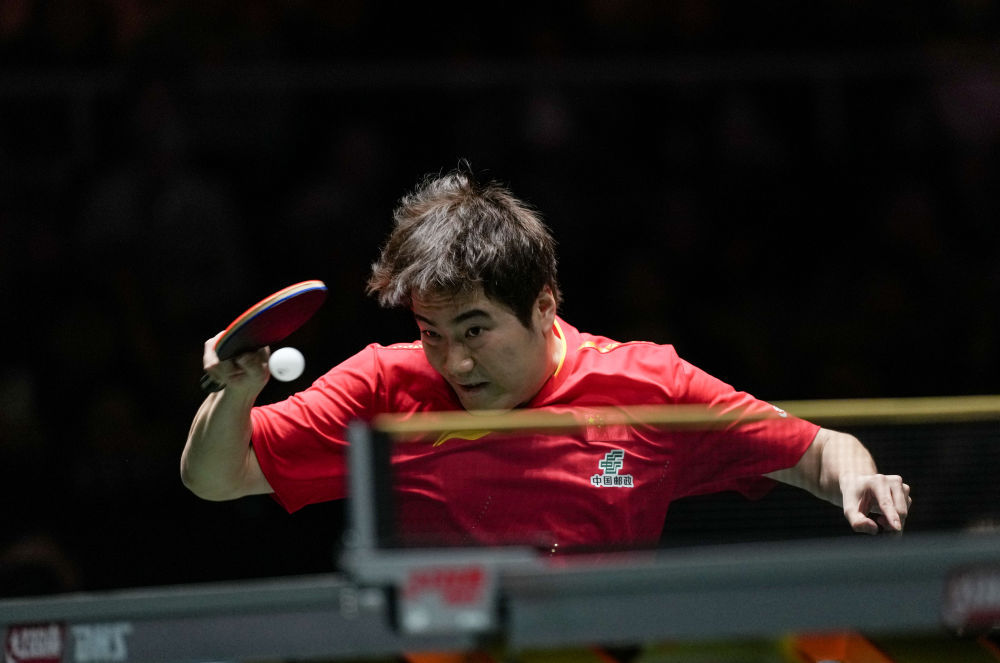 ↑ 中国队选手梁靖崑在男单比赛中。最终,他1比2不敌法国队选手费利克斯·勒布伦。 新华社记者 王迎 摄