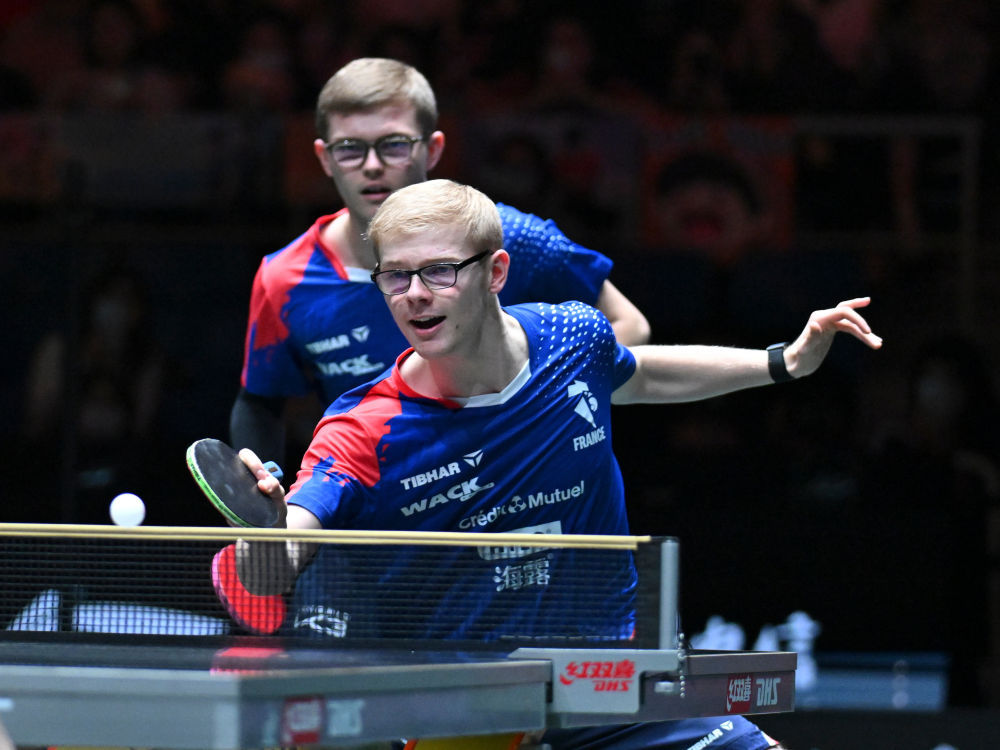 ↑ 法国队组合艾利克斯·勒布伦/费利克斯·勒布伦(右)在男双比赛中。他们0比1不敌中国队组合王楚钦/林诗栋。 新华社记者 王迎 摄