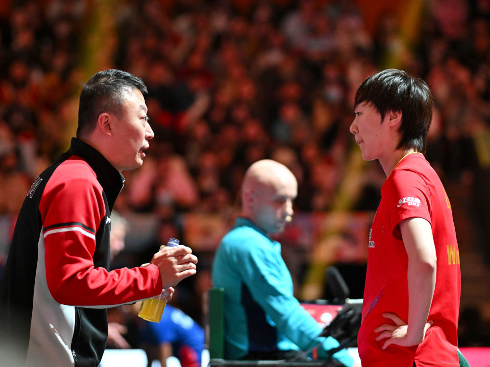 ↑ 中国队选手王曼昱(右)在女单比赛间隙与教练马琳交流。她3比0战胜法国队选手普利蒂卡·帕瓦德。 新华社记者 胥冰洁 摄