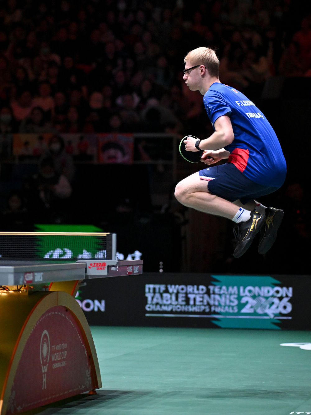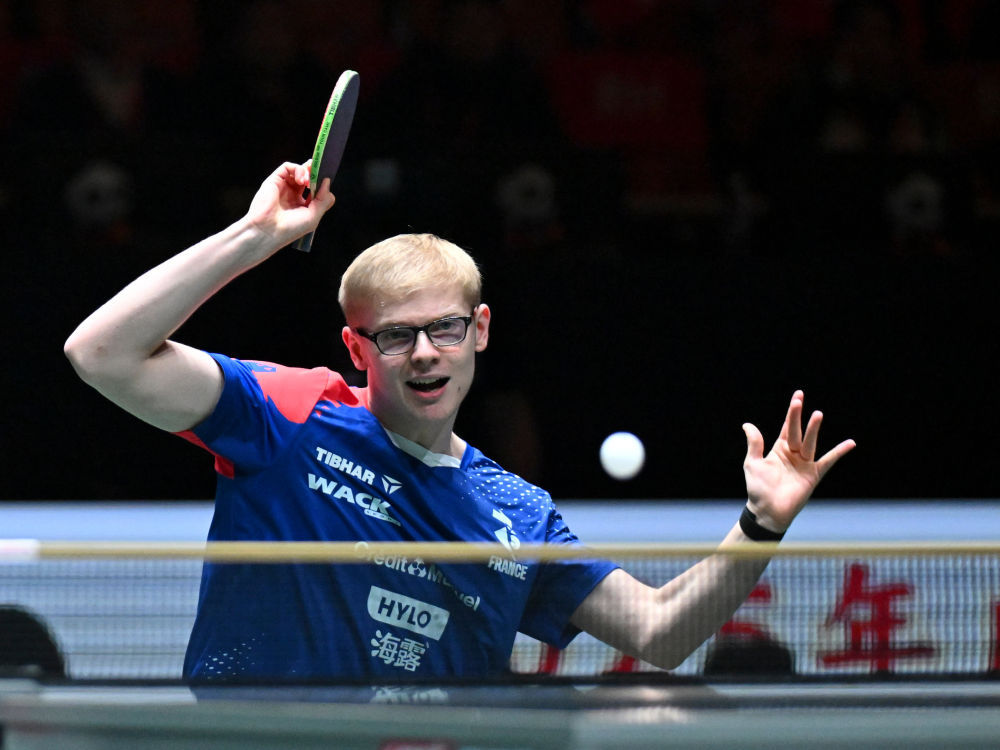 ↑ 法国队选手费利克斯·勒布伦在男单比赛中。最终,他2比1战胜中国队选手梁靖崑。 新华社记者 胥冰洁 摄