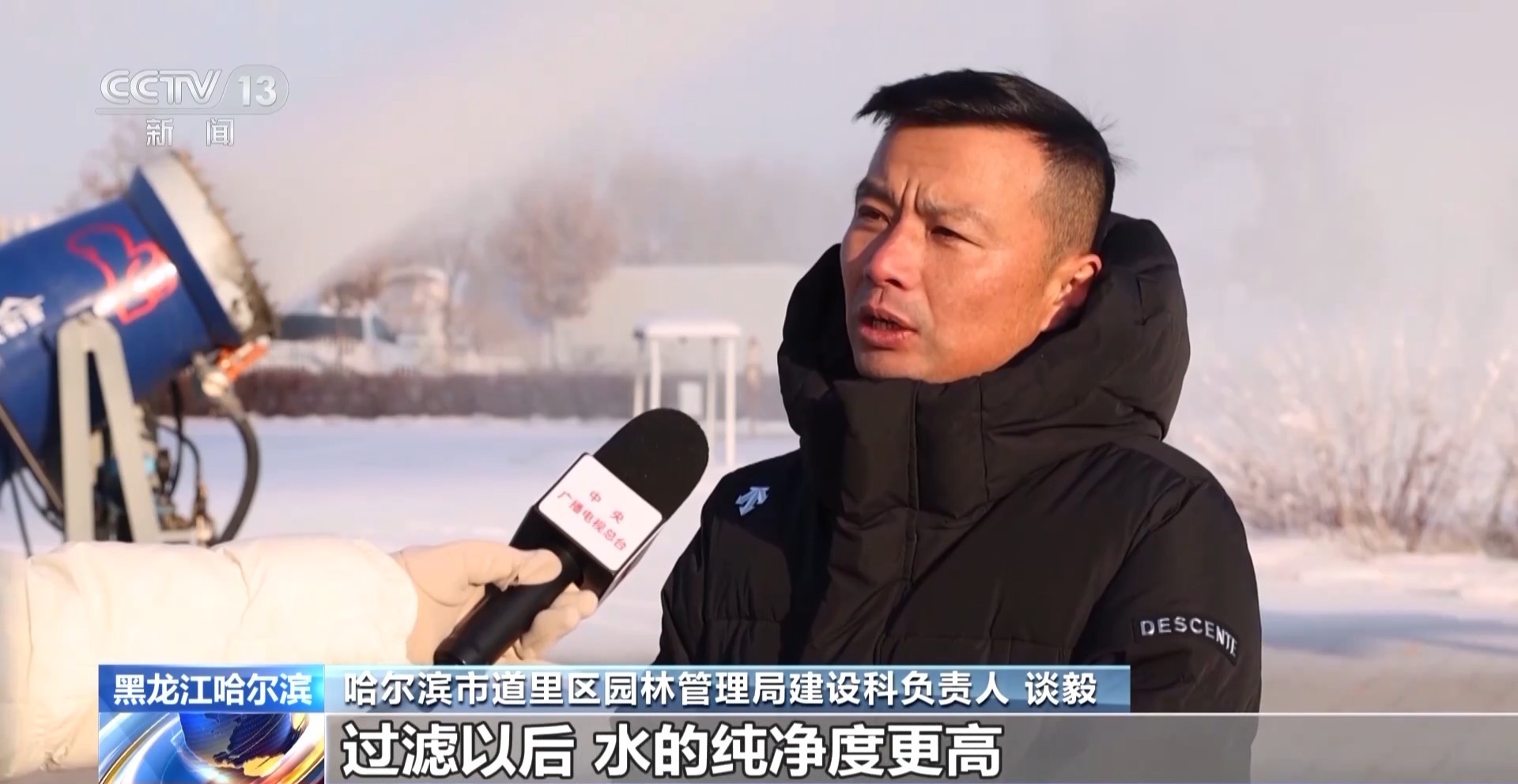 哈尔滨市道里区园林管理局建设科负责人 谈毅:我们在现场搭建了过滤池,过滤以后,水的纯净度更高,雪的杂质就会少,它可以保存的时间更长久,雪人也会陪伴大家的时间更长一点。