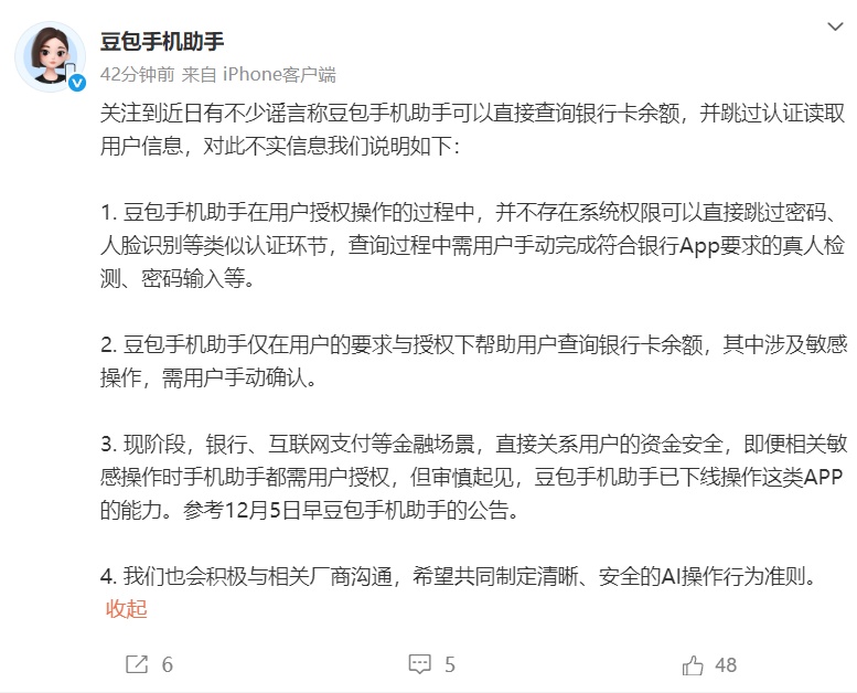 12月6日,豆包手机助手微博发布辟谣称,网传“豆包手机助手可以直接查询银行卡余额,并跳过认证读取用户信息”为谣言。