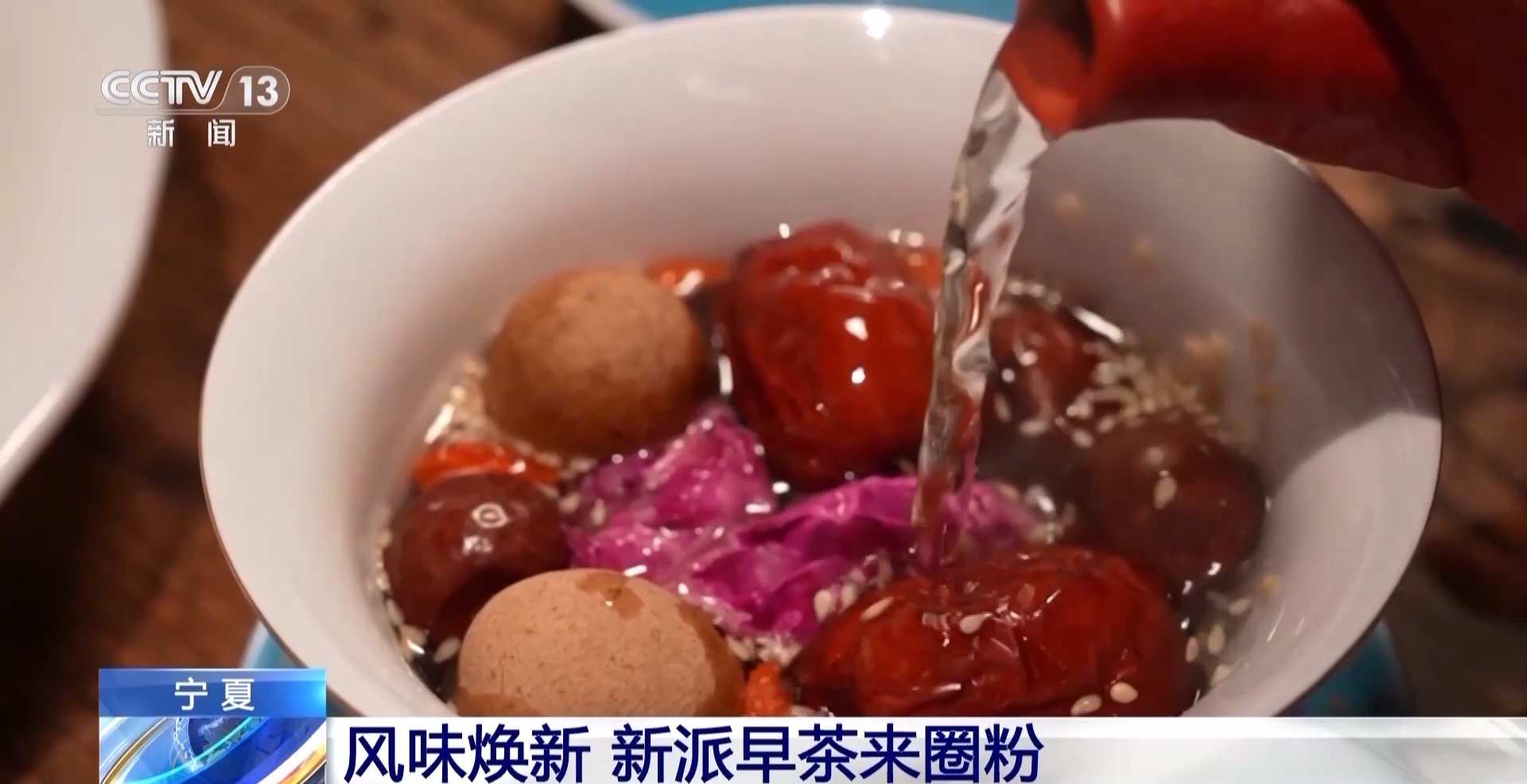 总台记者 刘思萌:宁夏人的经典早餐搭配,就是这样一杯八宝茶,再配上我面前的这些面点。如今,大家不仅可以根据自己喜欢的口味自己抓茶,而且还出现了很多颜值高、口感好的新式茶饮。