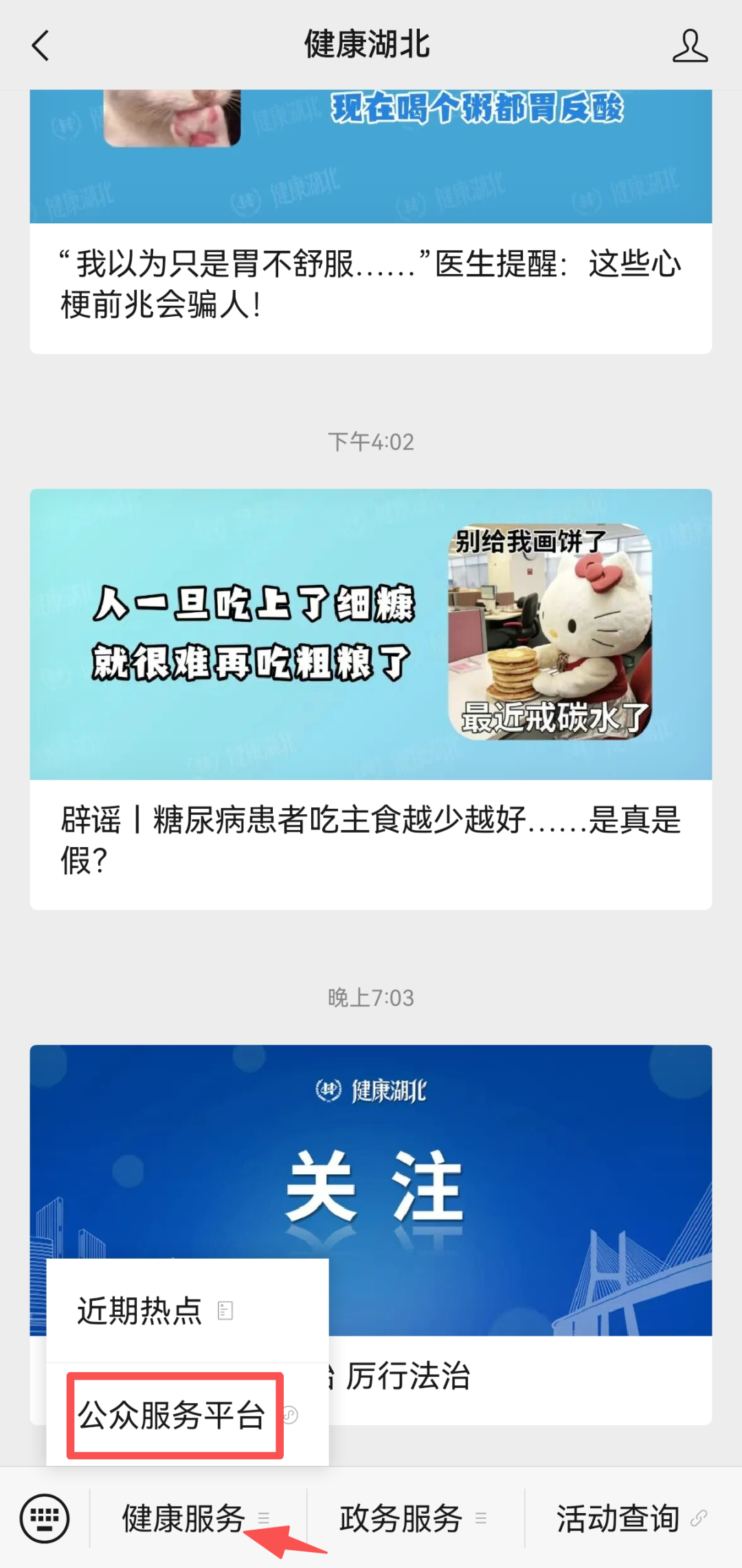 微信搜索“健康湖北”公众号,点击“健康服务”进入“公众服务平台”,点击最下方菜单栏中间那个醒目的入口,就是“楚大夫”的家。