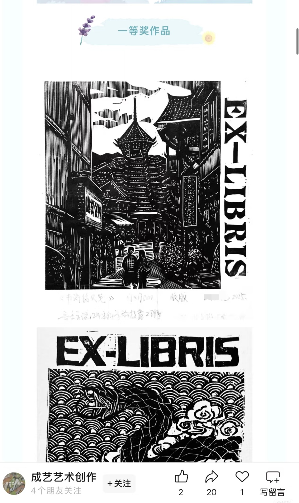 微信公众号“成艺艺术创作”曾发文介绍了此次作品展,该展览系由成艺大学艺术创作委员会、校图书馆、校团委联合主办的《世界读书日版画藏书票作品展》,展出了近200幅作品并评出了一、二、三等奖和创作奖。