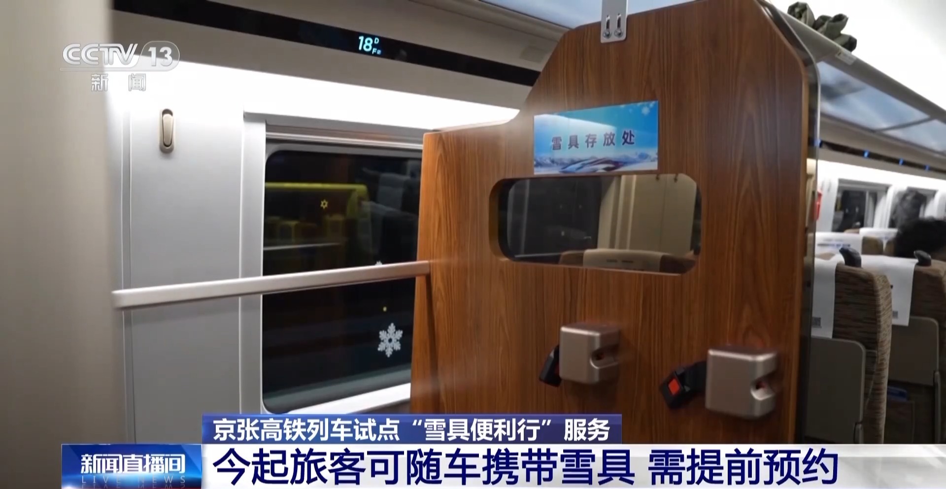 此次推出的“雪具便利行”服务,在京张高铁北京北至崇礼间的8趟G字头列车上试点。记者看到,试点列车二等座车厢部分座椅进行了适应性改造,设有专门的“雪具存放处”,旅客选择这项服务后可携带长、宽、高之和不超过200厘米的雪具同车出行,超规雪具仍须办理托运。