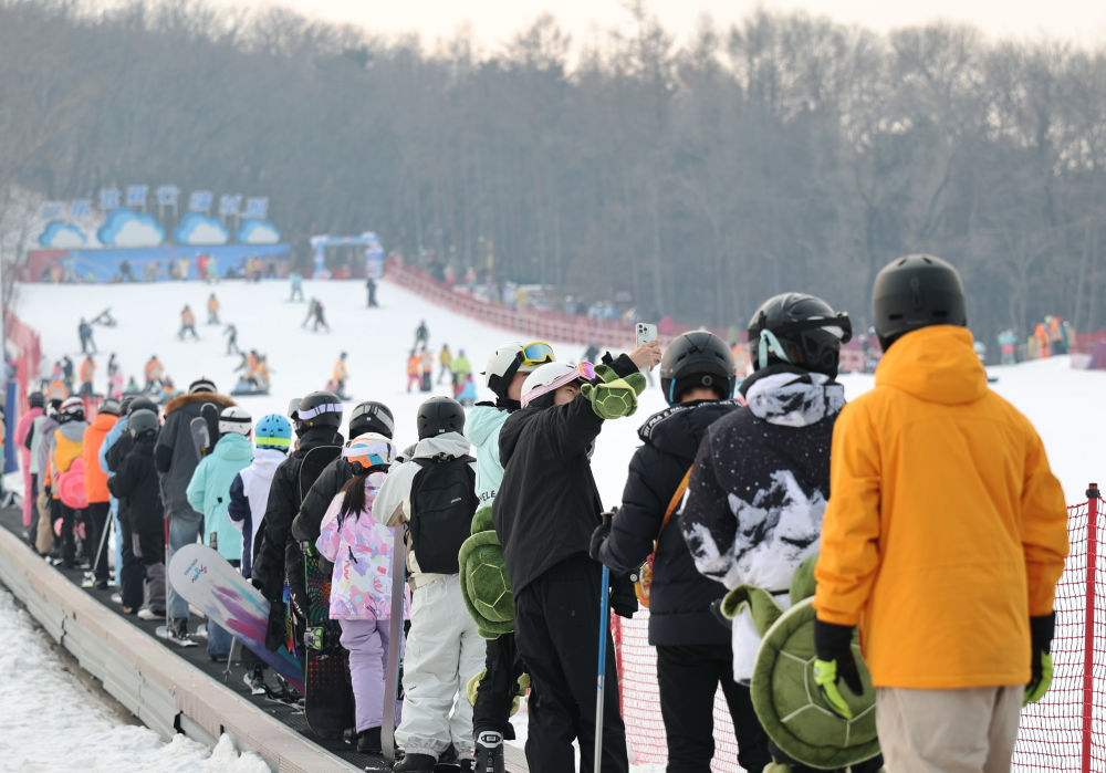 ↑12月6日,滑雪爱好者排队乘魔毯。