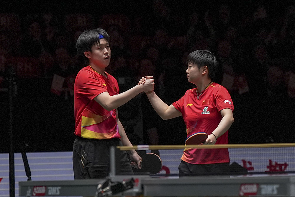 ↑ 中国队组合孙颖莎(右)/王楚钦在混双比赛获胜后庆祝。他们3比0战胜日本组合松岛辉空/大藤沙月。新华社记者 王曦 摄