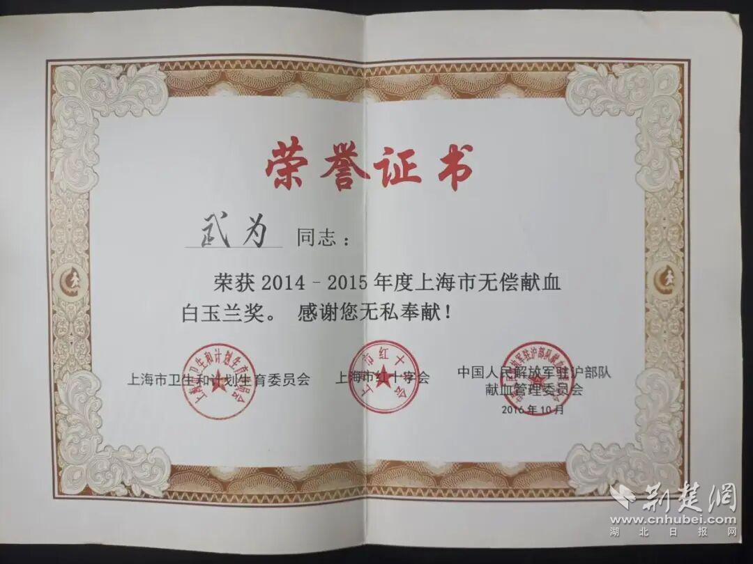 荆楚网(湖北日报网)讯(记者唐天琪 通讯员许佳仪)2013年从武汉城市学院毕业后,武为的生活里有两件事始终未变:坚持无偿献血,以及在工作中想着“多帮一个人”。16年间,他累计献血174次,总量达68300毫升,相当于14个成年人全身血液总量,献血证上记录着武汉、北京、上海等6座城市的印记。他先后5次获得“全国无偿献血奉献奖金奖”,还拿到过上海市无偿献血“白玉兰奖”、“徐州青年五四奖章”“沛县好人”“沛县十大杰出青年”等荣誉。