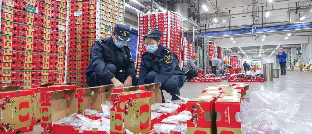 12月6日,南沙海关关员对进口车厘子进行监管。新华社发