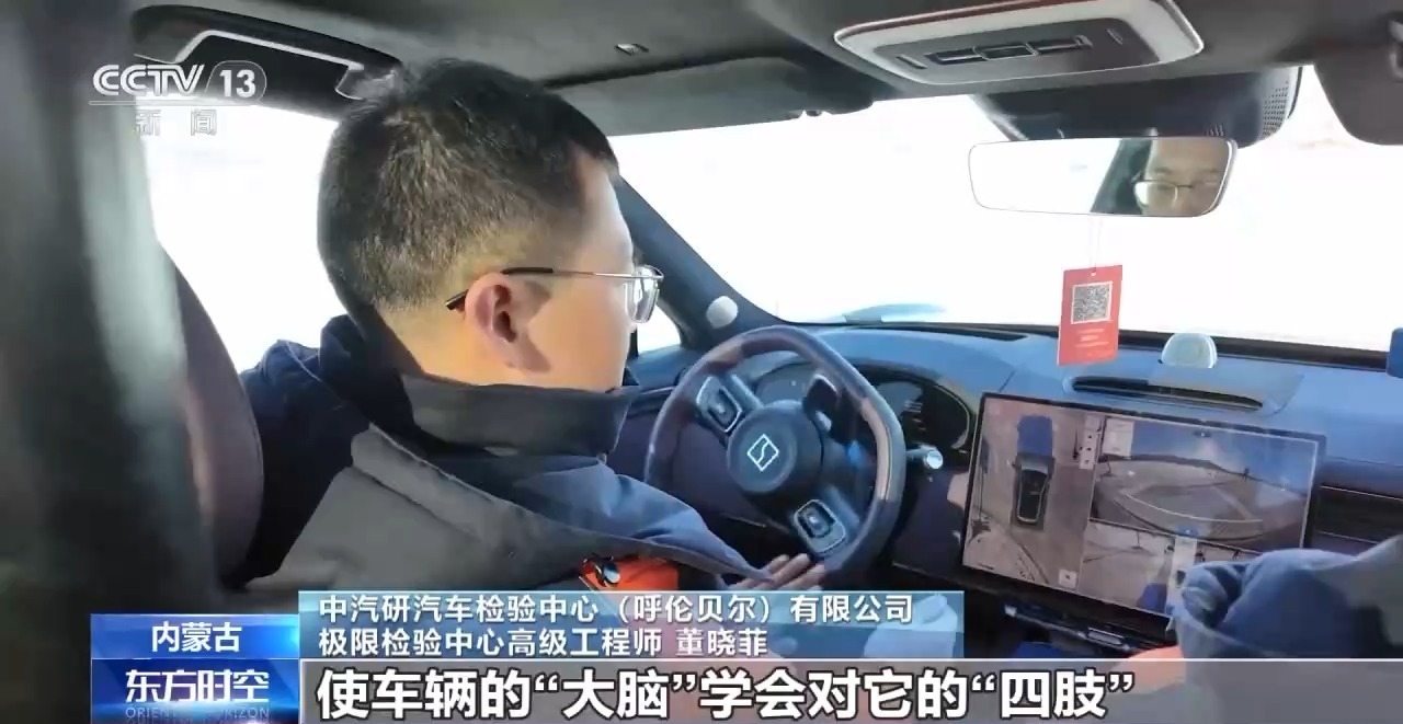 中汽研汽车检验中心(呼伦贝尔)有限公司极限检验中心高级工程师 董晓菲:车辆在冬季测试研发中会通过大量的测试与调试,使车辆的“大脑”学会对它的“四肢”,也就是车辆的四个车轮实现精准控制,给驾驶员提供精确的反馈和驾驶信心以及舒适的驾乘体验。