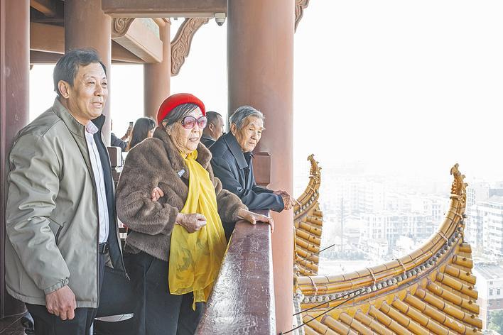 12月8日,抗日烈士黄骅的小女儿黄鲁彬(中)和家人回到家乡湖北,第一次登上黄鹤楼。 (湖北日报全媒记者 任勇 通讯员 江萌 摄)