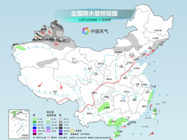 今明天,新疆降雪还将继续增多增强,局地有暴雪,我国中东部大部仍然维持雨雪稀少的格局。后天起,寒潮将与暖湿气流共同给中东部地区带来大范围雨雪天气。