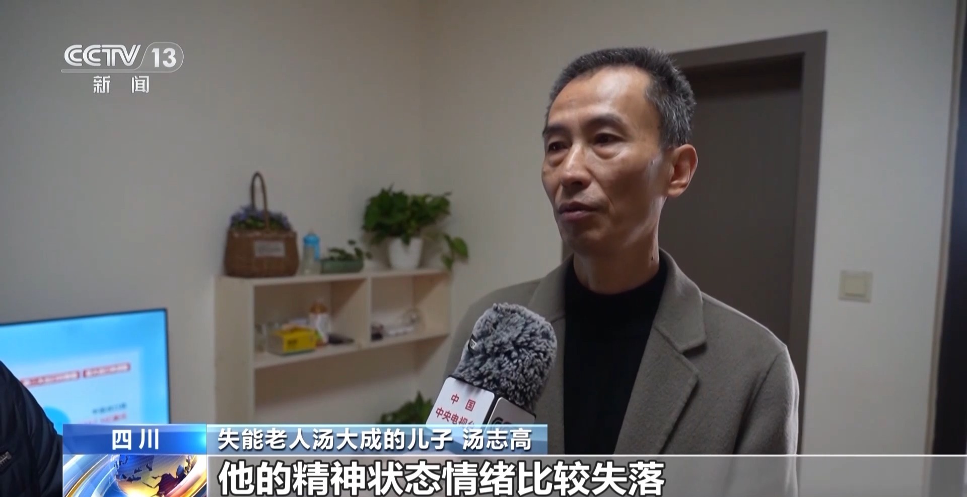 失能老人汤大成的儿子 汤志高:我爸刚开始的时候身体比较好,因为事发比较突然,他的精神状况还有情绪比较失落。护理员来了过后,慢慢他就好些了,我的压力也就小一些了。