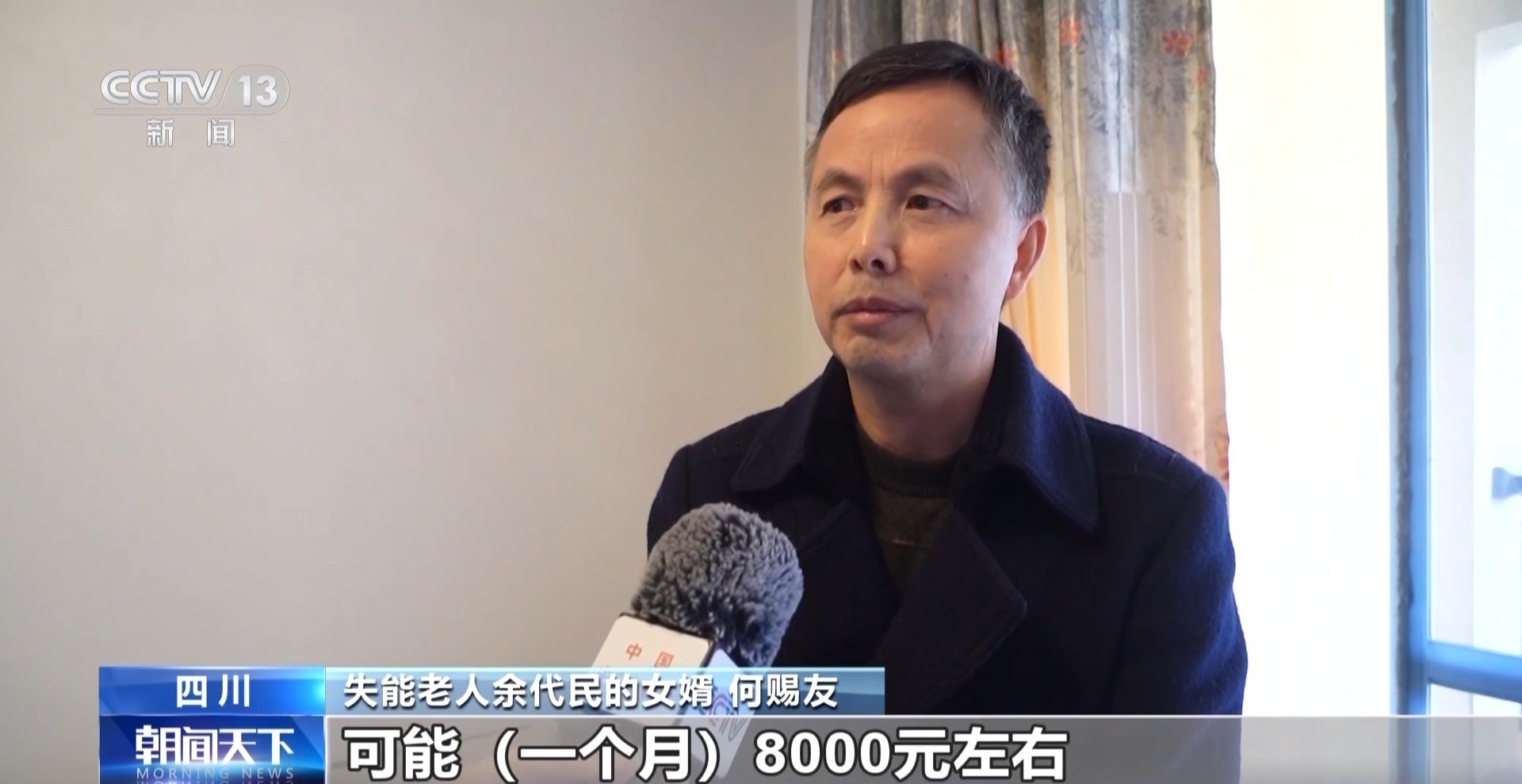 失能老人余代民的女婿 何赐友:护工一个月4000多元,租房子是1000多元,还有生活,全部一起的开销可能一个月8000元左右,所以压力很大。岳母病情越来越严重,以前还可以下来走,现在她的吞咽功能都比较差了,因为我们不是专业照顾,所以我们期待评审能够通过。
