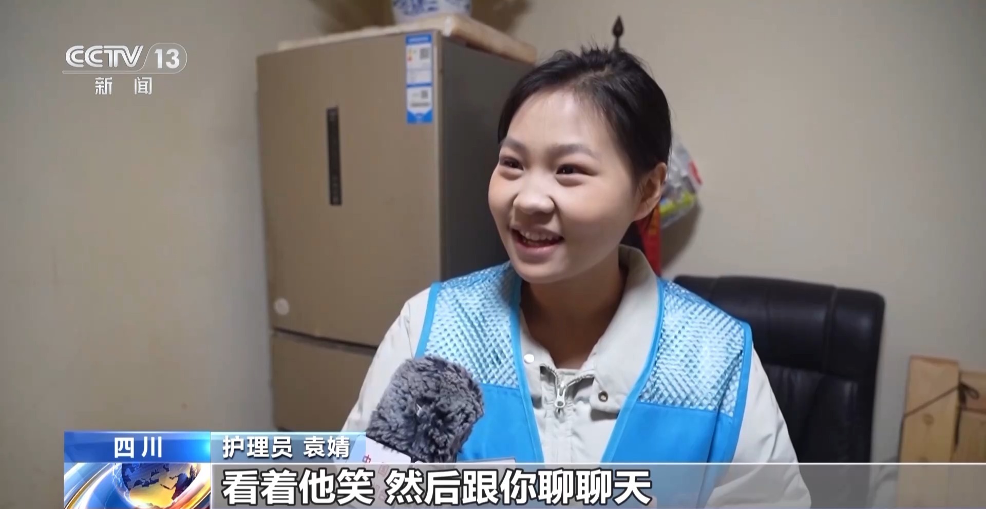 护理员 袁婧:感觉我年纪太小了,太年轻了,去干这个行业,家属可能觉得你不够专业,但是自己一次次上门之后,他就发现你还是很有专业技能的,就慢慢地认可我。像爷爷最开始他不愿意搭理我,不跟我说话,我就上门陪他,陪爷爷聊天,你看着他笑,跟你聊聊天,你就会非常开心,我觉得很有成就感。
