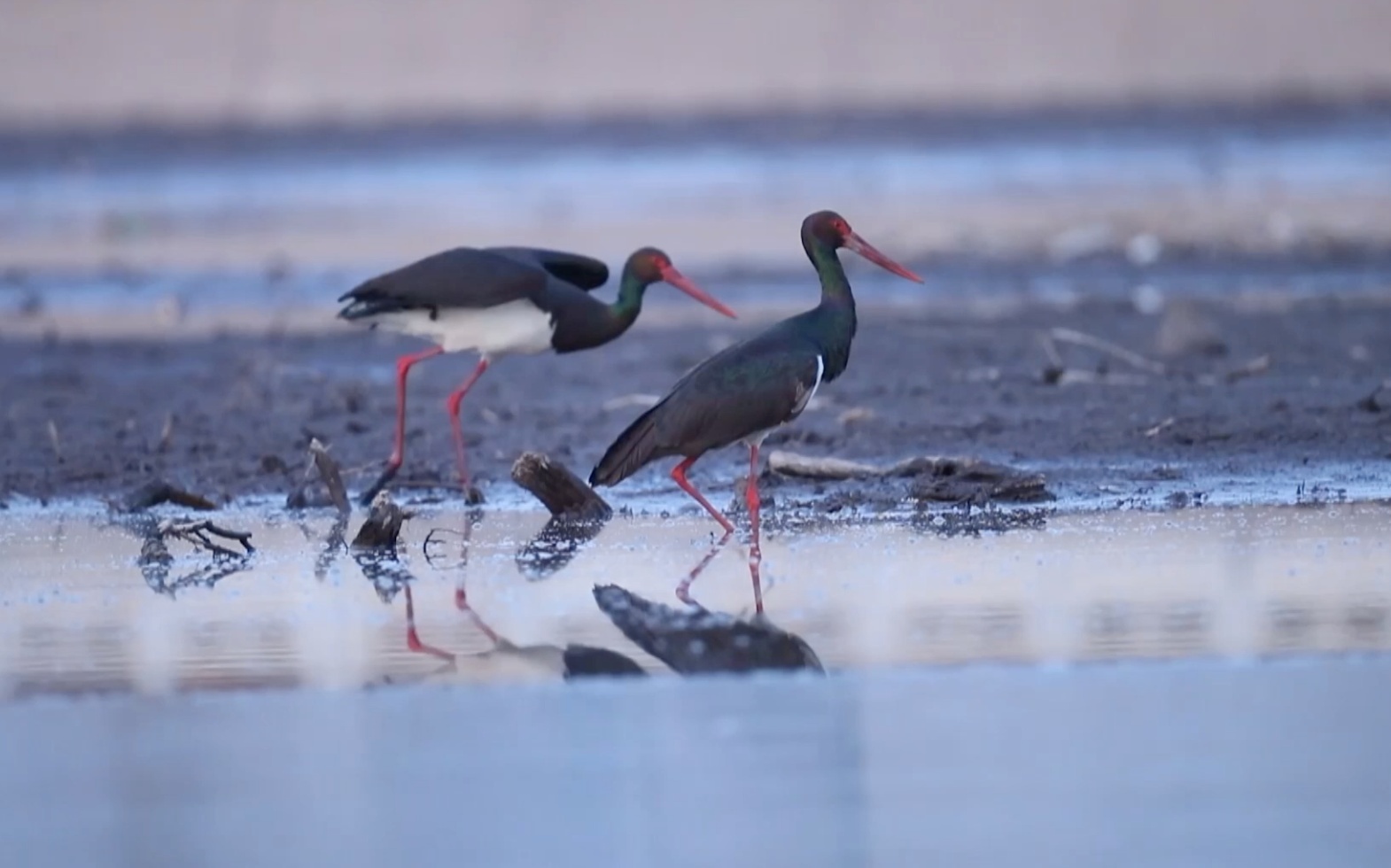 黑鹳,属于国家一级重点保护野生动物,作为一种大体型候鸟,其站立时身高约为1米,翼展可达1.5米左右,主要以鱼类为主食,常栖息于河流沿岸、沼泽湿地与山区溪流附近。近年来,随着生态持续向好,当地桃河流域的候鸟种类逐年增加。