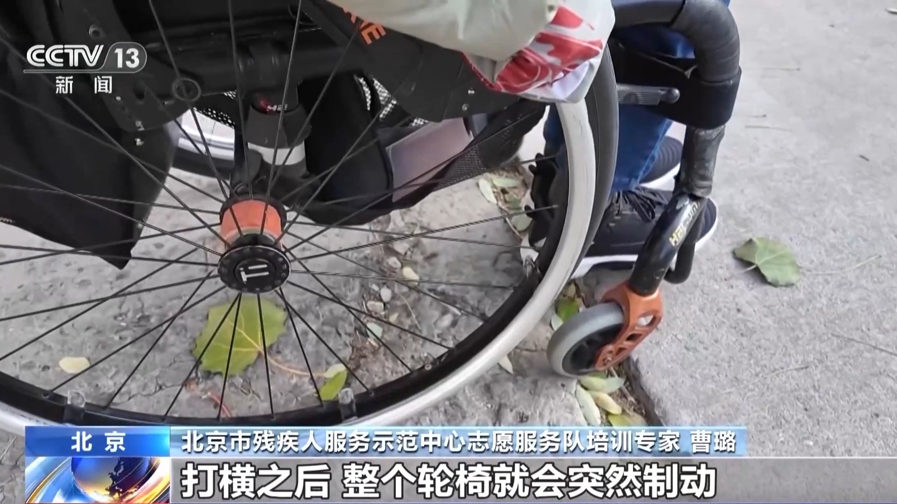 北京市残疾人服务示范中心志愿服务队培训专家 曹璐:出现的事物和问题大多数都出现在前小轮的变向上面,前小轮是一个万向轮,但同时会有一个风险,如果它遇到一个非常微小的坎,就会打横,整个轮椅就会突然制动。