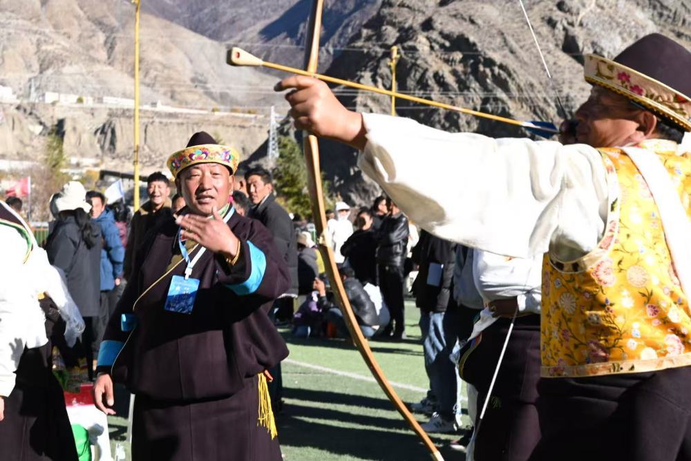西藏自治区林芝响箭比赛已连续举办十届,是西藏规模最大、影响最广泛的响箭比赛之一。比赛前,村民们身着盛装、携酒备肴,早早就来到赛场等待。比赛过程中,人们唱起旋律激昂、提振士气的箭歌,跳起“工布箭舞”,射中箭靶后,射手们还会与队友击掌相庆,呼喊“擦秀”(藏语“庆祝”之意)以示鼓励,现场氛围好不热闹。