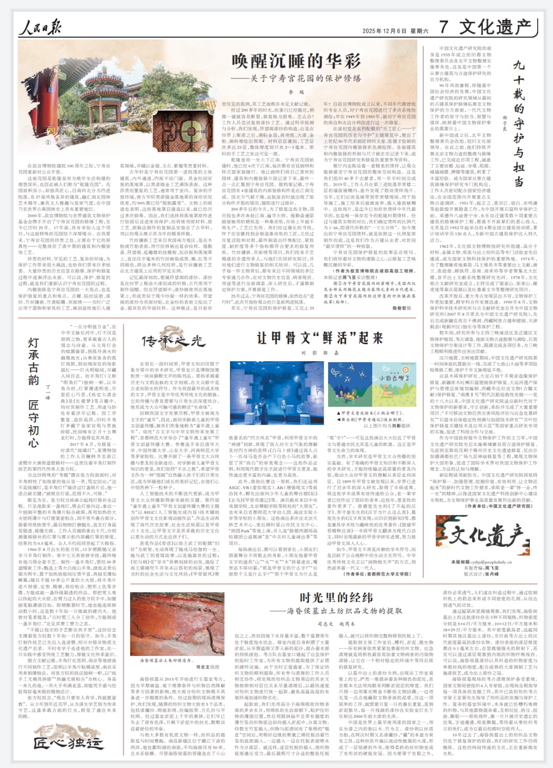 200多年后的今天,为了修复这些文物,项目组也多次奔赴江南、遍寻大师。倦勤斋通景画装裱用的褙纸是一种桑皮纸,市场上早就不再生产,工艺已失传。我们经过漫长的寻找,终于在安徽找到会制造桑皮纸的工匠,又经过反复试验和对照,最终制造出纤维配比、紧致度、耐折度等多个指标都符合要求的修复用纸。竹丝镶嵌、双面绣等项目,我们找来手艺精湛的非遗传承人,与他们共同研究探讨,并对他们进行文物修复的相关培训。可以说,几乎每一件文物背后,都有来自不同领域的多位专家通力合作,在对文物历史信息、病害现状、用途等进行全面调查、深入研究后,才谨慎制定保护方案,开展修复工作。