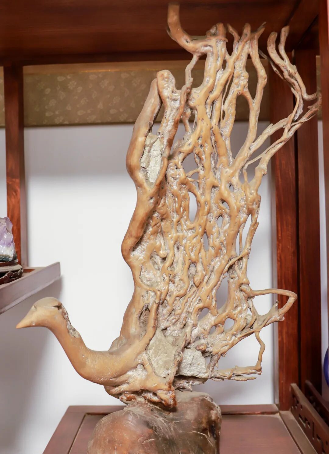 “你看这个树根,它原本被遗弃在山野里,但它的形态、它的纹理,都在向我诉说着一个故事。” 在姜老师家中,那些看似平平无奇的枯木,经他巧手雕琢,便化作了《母子情》《凤凰》《孔雀》等艺术珍品。这便是根艺,一门化腐朽为神奇的艺术。