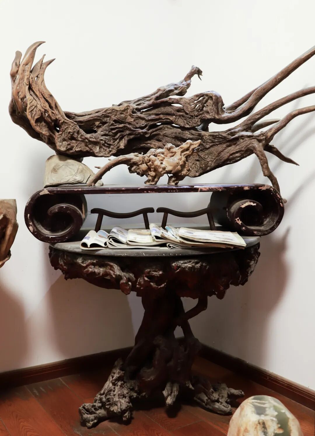 上世纪八九十年代,在武汉无线电工业学校(武汉职业技术大学前身)担任绿化管理员和园艺师的姜老师,偶然间与根艺结缘。为了寻找到一块心仪的原材料,他常常孤身一人钻进深山老林,一去就是一整天,旁人眼中的辛苦,在他看来却是寻宝的乐趣。