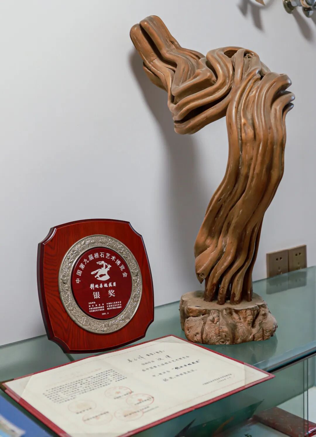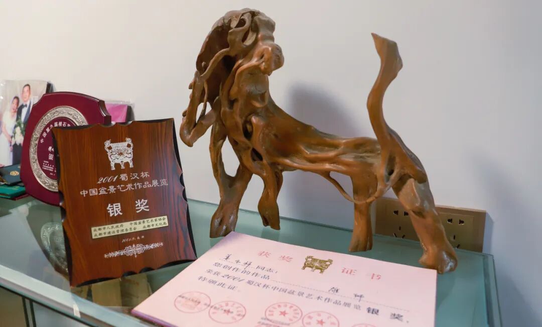 2001年,他的根艺作品《雄狮》获“蜀汉杯中国盆景艺术展”银奖;2004年,《旋律》获第九届中国根石艺术展银奖……荣誉纷至沓来,但他最珍视的,始终是创作过程中那份与自然物我两忘的纯粹。他用刻刀赋予枯木第二次生命,也在这份锲而不舍的追求中,雕刻着自己的艺术人生。